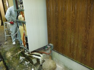 ( エコ給湯器の設置工事も、だんだん多くなってきた…..)